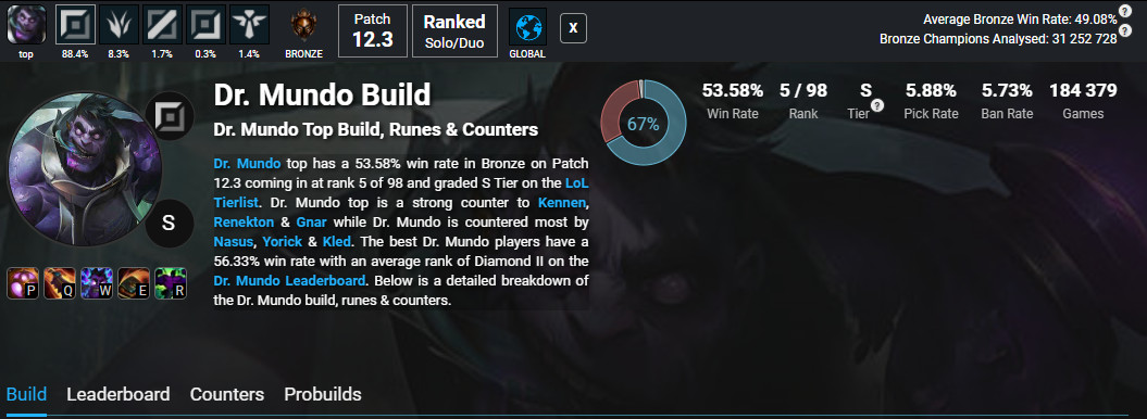 A Zaun őrültje két teljesen ellentétes irányba is elment, amikor a rangsorolt ELO-kon belüli győzelmi arányokról van szó. A magas szintű meccseken Dr. Mundo nehezen képes csorbát ejteni az ellenfelein. Az alacsonyabb szinteken, például a bronz és ezüst ELO-ban azonban a top laner bő 54 százalékos győzelmi aránnyal büszkélkedhet.