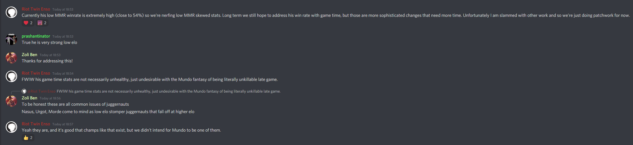 Anderson hozzátette: „Nasus, Urgot, Morde jó példák a juggernautokra, amelyek magas ELO-nál kiesnek. Jó, hogy ilyen bajnokok is léteznek. De a Mundót nem szántuk annak.”
