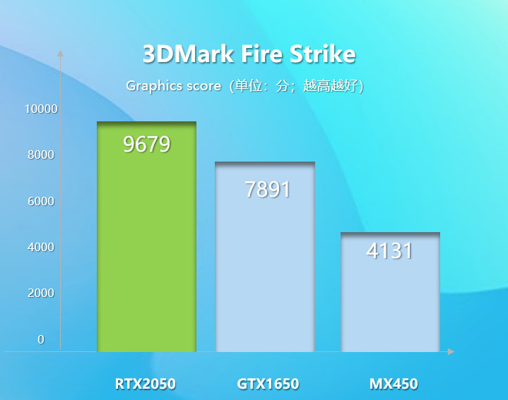 Az ITHome jelentése szerint a GeForce RTX 2050 9,673 pontot ért el a benchmarkban. A GeForce GTX 1650-hez (7891 pont) és a GeForce MX450-hez (4131) képest jól teljesített. A 3D Mark Fire Strike benchmarkban a Turing-alapú GeForce GTX 1650 Ti és GTX 1660 Ti között helyezkedik el. A GeForce RTX 2050 alacsony VRAM- és memória-sávszélessége a GeForce MX570 szintjére korlátozza a teljesítményét.