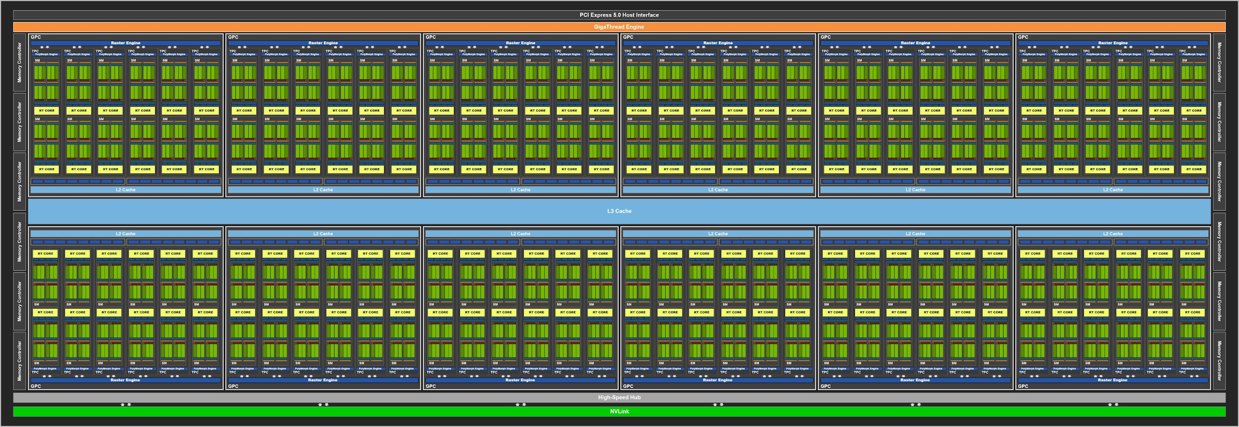 A fenti képen a flagship modellekbe szánt AD102 egység vázlatát láthatjuk. Az RTX 4000 GPU-k akár 71%-kal több magot tartalmazhatnak, mint az előző generáció. Ami még figyelemre méltó, az az L2 Cache növekedése, ott sokszoros növekedést olvashatunk le. A chipek csíkszélessége is nagyot csökken, a korábbi 8 nanométeres Samsung gyártósor helyett a TSMC N5 szalagjáról gurulnak majd az Ada Lovelace kódnevet viselő számítási egységek.