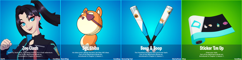 Bár elsőre a Zoe Clash névre hallgató outfit Item Shoposnak is tűnhetett, a pickaxe „Starterpack” címkéje hamar elárulta az Epic Games tervét. Az alábbi kozmetikai tárgyakat kapjuk meg a csomag megvásárlásával: