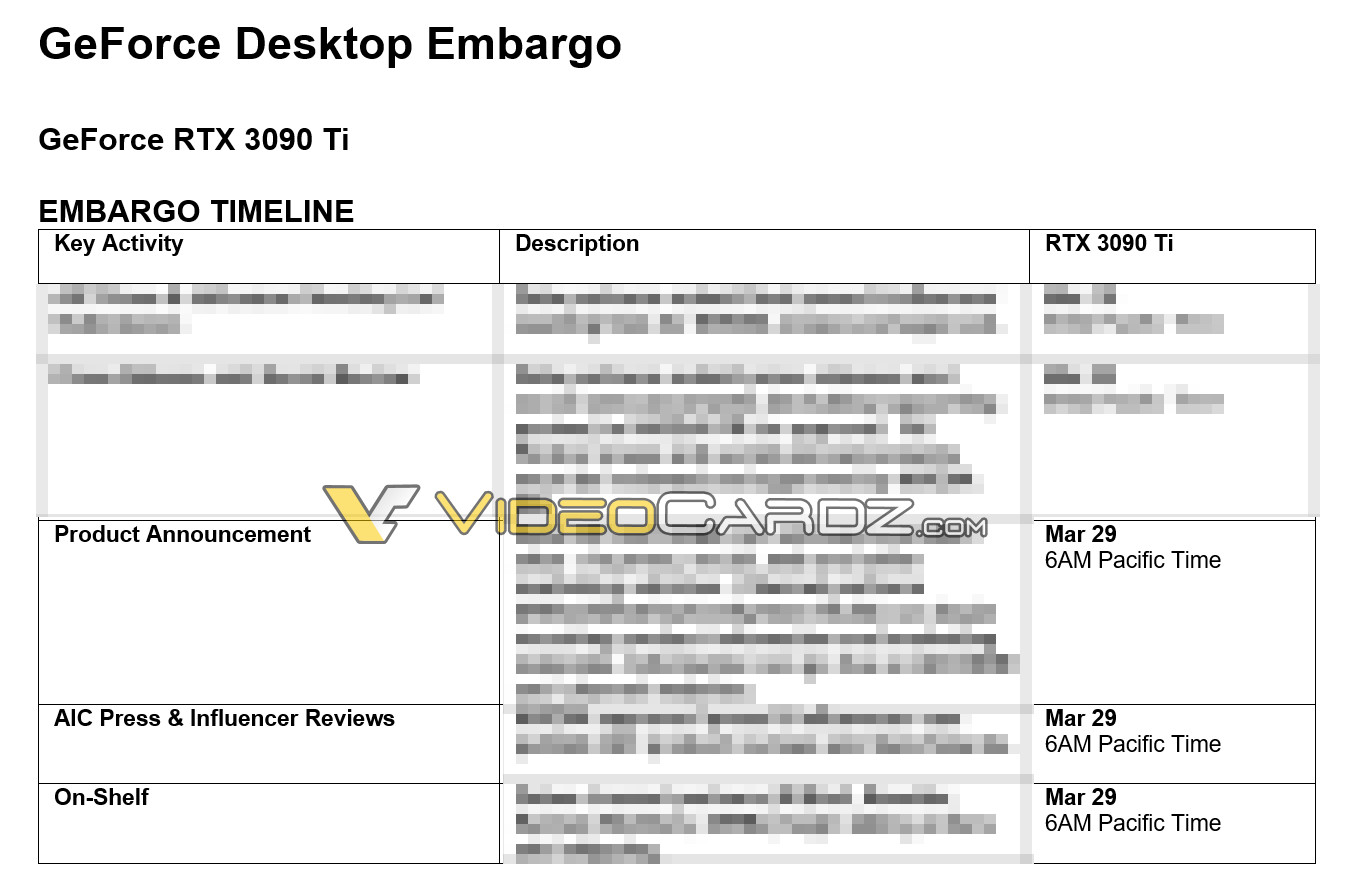 A videocardz csapata szerezte meg a 3090 Ti embargójával és webáruházakba kerülésével kapcsolatos időpontokat, melyeken nagy eséllyel már nem fog változtatni az Nvidia. Az embargó lejáratával publikálhatják a weboldalak a 3090 Ti teszteket, de valószínűleg már a hónap közepén megkaphatják azokat.