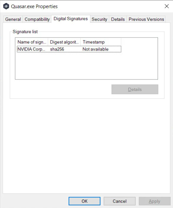 Az egyik ilyen kártevő, amely a VirusTotal vírusirtó szolgáltatóhoz került, a Quasar RAT (remote-access trojan) egy NVIDIA tanúsítványokkal aláírt változata. A RAT a háttérben működik, és távoli hozzáférést biztosít egy írási-olvasási hozzáféréssel rendelkező támadócsoport számára, amely aztán bármit megtehet az adatok ellopásától kezdve az adatok titkosításával történő váltságdíjkiszabásig.