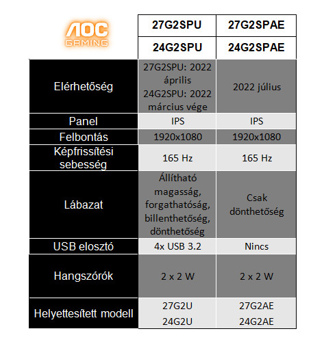 Az AOC GAMING 24G2SPU és 27G2SPU 2022 március végétől / áprilistól kapható 249,00 € és 299,00 € ajánlott fogyasztói áron.