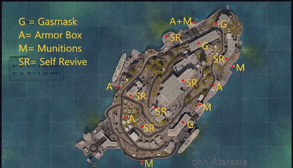 A térképet ohhAtaraxia Reddit felhasználónak köszönhetjük. A jelölések pillanatok alatt értelmezhetőek, hiszen az adott tárgyak nevei is rákerültek a pontok mellé. Fontos kiemelni, hogy nem 100%-os loot spawnról beszélhetünk, így nem biztos, hogy minden meccsen megtaláljuk majd ott az ajándék tárgyakat. A helyük azonban szerencsére nem változik, így az „A” betűvel jelölt pontokban mindig csak Armor Boxot találunk, ha épp úgy akarja a szerver is.