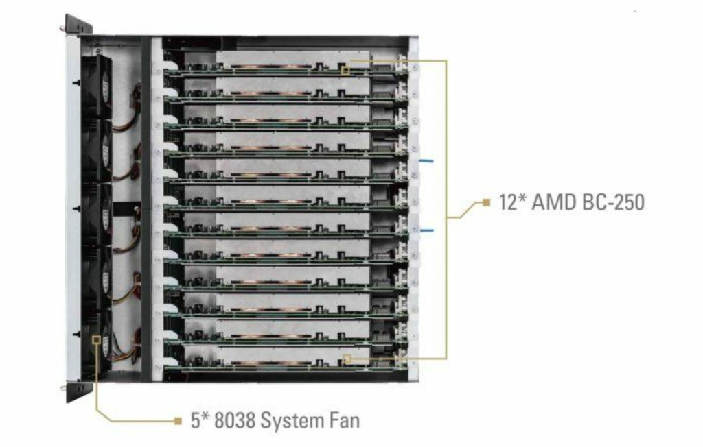 Az ASRock weblapján pár nappal ezelőtt egy fura termék került fel. Ez nem más, mint az ASRock BC-250 Mining Rig,  mely nevéből adódóan értelemszerűen bányászásra fogható be. A gépben összesen 12 darab AMD BC-250 egységet találhatunk 5 ventilátor társaságában. Természetesen egy ilyen szintű rendszer fogyasztása nem kevés, ezért két darab 1200 wattos táp látja el energiával a bányászgépet. Eddig nem is tűnik érdekesnek a fenti Rig, ám a BC-250 nem egy mindenki által megvehető videókártya.