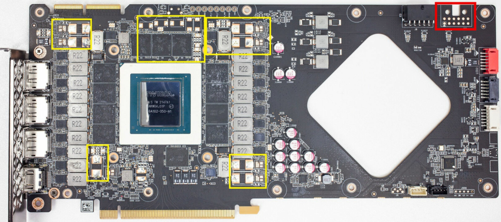 Az összes high-end RTX 40 kártya 16 pines Gen 5 csatlakozóval érkezik majd, az egyedi, nem referencia modellek talán kettővel is, így meg sem lepődünk, hogy több 3090 Ti NYÁK-ján meg is találhatjuk ezek helyét is. Az Nvidia és a fentebb említett partnerek nem bíztak semmit a véletlenre, a 3090 Ti ideális volt ezen fejlesztések letesztelésére, így kevesebb problémába futhatnak majd bele a tényleges gyártás során.