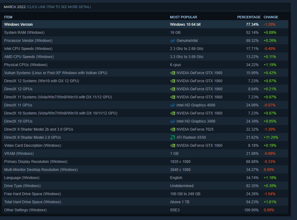 Manapság, amikor a videókártya-piac kezd kicsit helyreállni, sokszor előkerül az a kérdés, hogy mit értünk ma egy „átlagos” gaming PC alatt. Ezt meglehetősen nehéz lenne megválaszolni, hiszen egy többmilliós gép tulajdonosa teljesen mást értene a kifejezés alatt, mint az, aki 2010 óta ugyanazt a PC-t használja. Ilyenkor érdemes valamilyen statisztikához nyúlni, talán a legjobb választás a szinte minden gépen ott figyelő Steam lehet. 2021 novemberében már megvizsgáltuk a specifikációkat, azóta szinte nem is változott semmit az átlagos gép felépítése, egyetlen egy hatalmas dolgot kivéve.