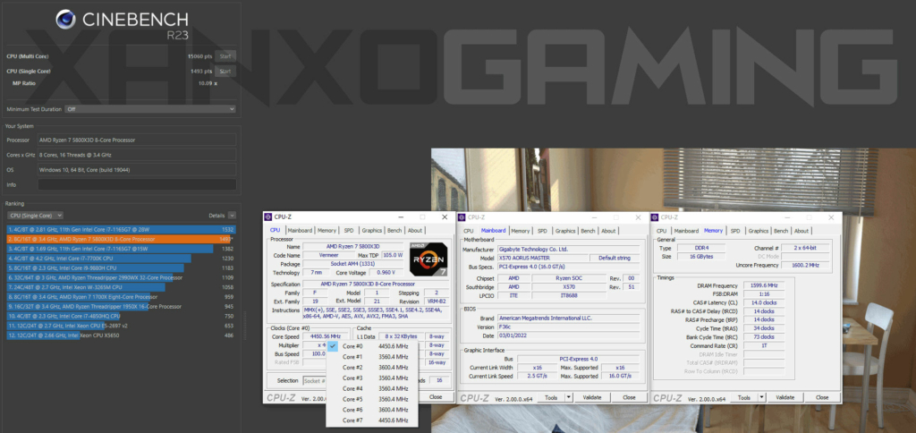 A 8 maggal és 16 szállal felvértezett egységet Geekbench és CineBench alatt is sikerült megizzasztani, de a CPU-Z sem maradhatott ki a repertoárból. A processzor egy frissített BIOS-szal felvértezett Gigabyte AORUS Master X570 lap, 16 GB DDR4 memória és egy RTX 3080 Ti társaságában teljesítette a méréseket. Az operációs rendszer maradt Windows 10, bár ebben az esetben elhanyagolható lehet a különbség, hiszen itt nem beszélhetünk P/E magokról, mint az Intel 12. generációjánál.