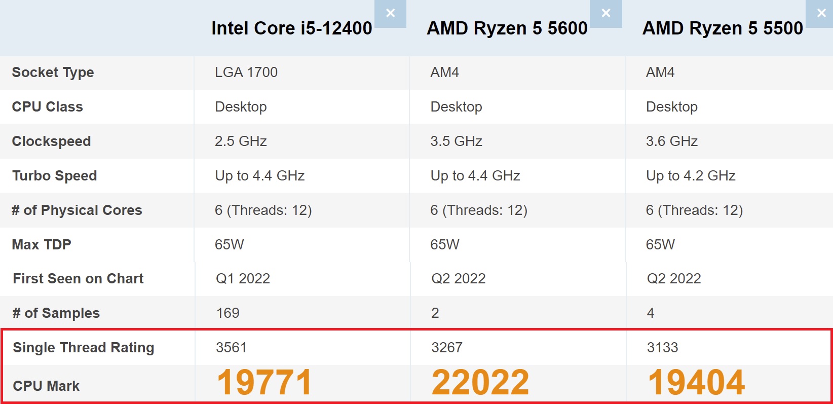 Úgy látszik, hogy az AMD tökéletesen lőtte be az újoncokat. Mindhárom (i5-12400, Ryzen 5 5500 és 5600) esetében 6 fizikai magról és 12 szálról beszélhetünk, így ennél jobb összehasonlításra nincs is szükségünk. Az i5-12400 és Ryzen 5 5500 nyers teljesítménye szinte megegyezik, míg az 5600 szépen állva hagyja őket a PassMark tesztjében. Azt azért egyértelműen leolvashatjuk, hogy egyszálas teljesítményben az Intel az úr és bizony ezt kamatoztatni is tudja játékok alatt. Bár a PassMark pontszámok alapján a Ryzen 5 5500 az Intel i5-12400 ellenfele, a valóság nem egészen ezt mutatja.