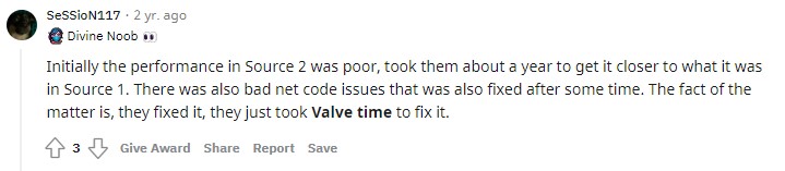 A Dota 2 frissítése után a CS:GO közösség szinte minden egyes új frissítésben a Source 2-re váltást várta, ám pár hónapon belül mémmé is vált a jelenség, hiszen csak nem akart megérkezni a játékmotor. Azóta azért néhány Source 2 fejlesztés megérkezett az FPS lövöldébe, a Panorama felhasználói felület és HRTF hangrendszer személyében, de ezek technikailag a régi Source motorra „lebutított” változatok. A pletykák alapján az „új” Dust 2 is Source 2 alapokon készült, melyeket később backportoltak a régi változatra. Az biztos, hogy a natív Source 2-re váltás sok előnnyel kecsegtetne: