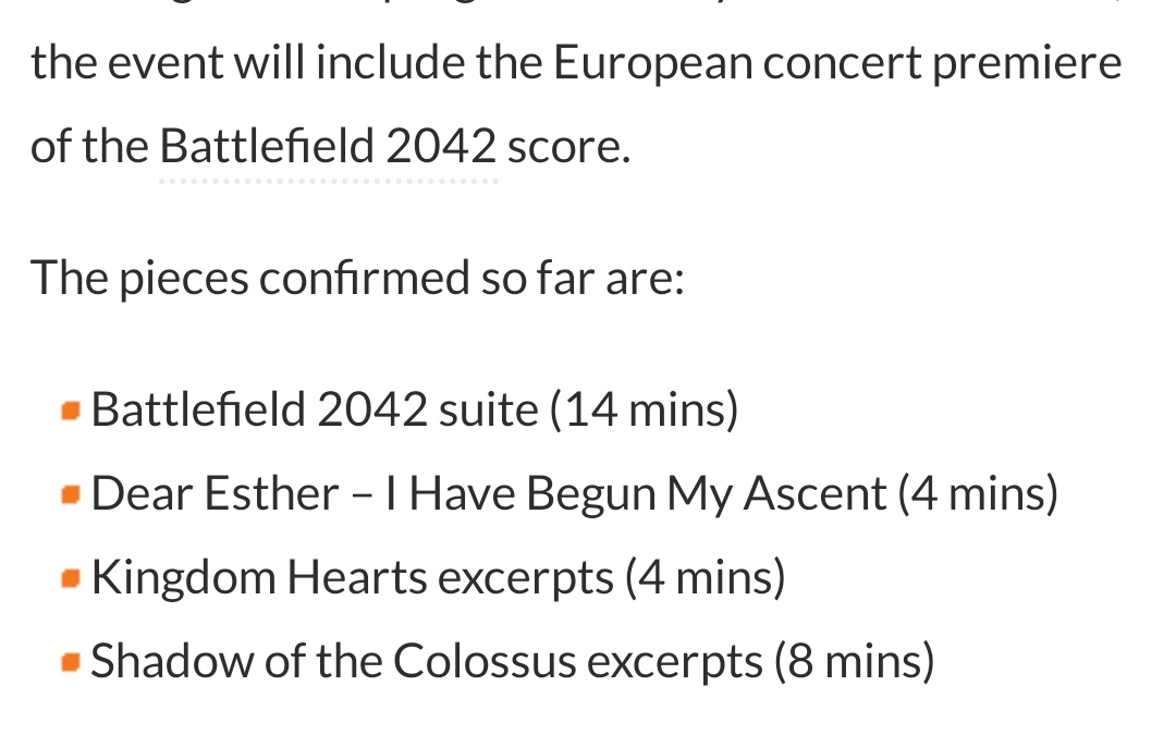 A dalok közé olyan játékok zenéi kerültek be, mint a Dear Esther, a Kingdom Hearts, a Shadow of the Colossus, és a Battlefield 2042. A dalokat élő zenekar fogja előadni a koncert alatt, de amint alább látható, a Battlefield közösséget nem nyűgözi le a választás.