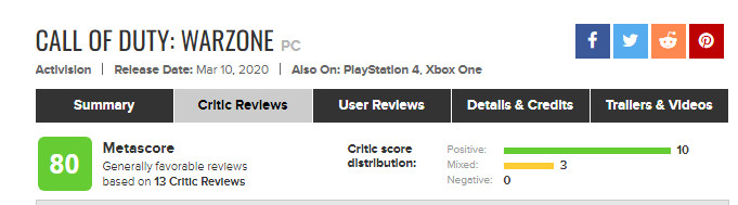 A megítélésnél most a PC-s változatot vettük alapul, de higgyétek el, a konzolosok esetében is hasonló a helyzet, kisebb eltérésekkel. Amint látható, a Warzone megjelenésekor a kritikusok igencsak jóra értékelték a játékot. 13 tesztelő szakmai oldalból csak 3-nak voltak vegyesek az érzései, negatívra senki nem értékelt. Így érte el a Warzone a 80-as kritikai pontszámot. Ez persze 2020-as értékelés.