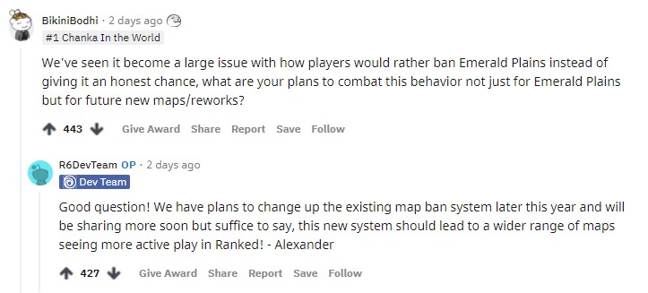 BikiniBodhi tett fel egy igazán érdekes kérdést a fejlesztőknek, mely a rengeteg egyetértő upvote miatt hamar a Ubisoft munkatársai elé is jutott. Kifejtette, hogy tapasztalata alapján a játékosok egyszerűen nem adnak esélyt az átdolgozott vagy épp teljesen új pályáknak, mint például a frissen megérkezett Emerald Plains, hanem azonnal bannolják őket. Arra volt kíváncsi, hogy a fejlesztők igyekeznek-e majd valamit változtatni ebben az ügyben vagy teljesen a felhasználókra bízzák a döntést továbbra is.