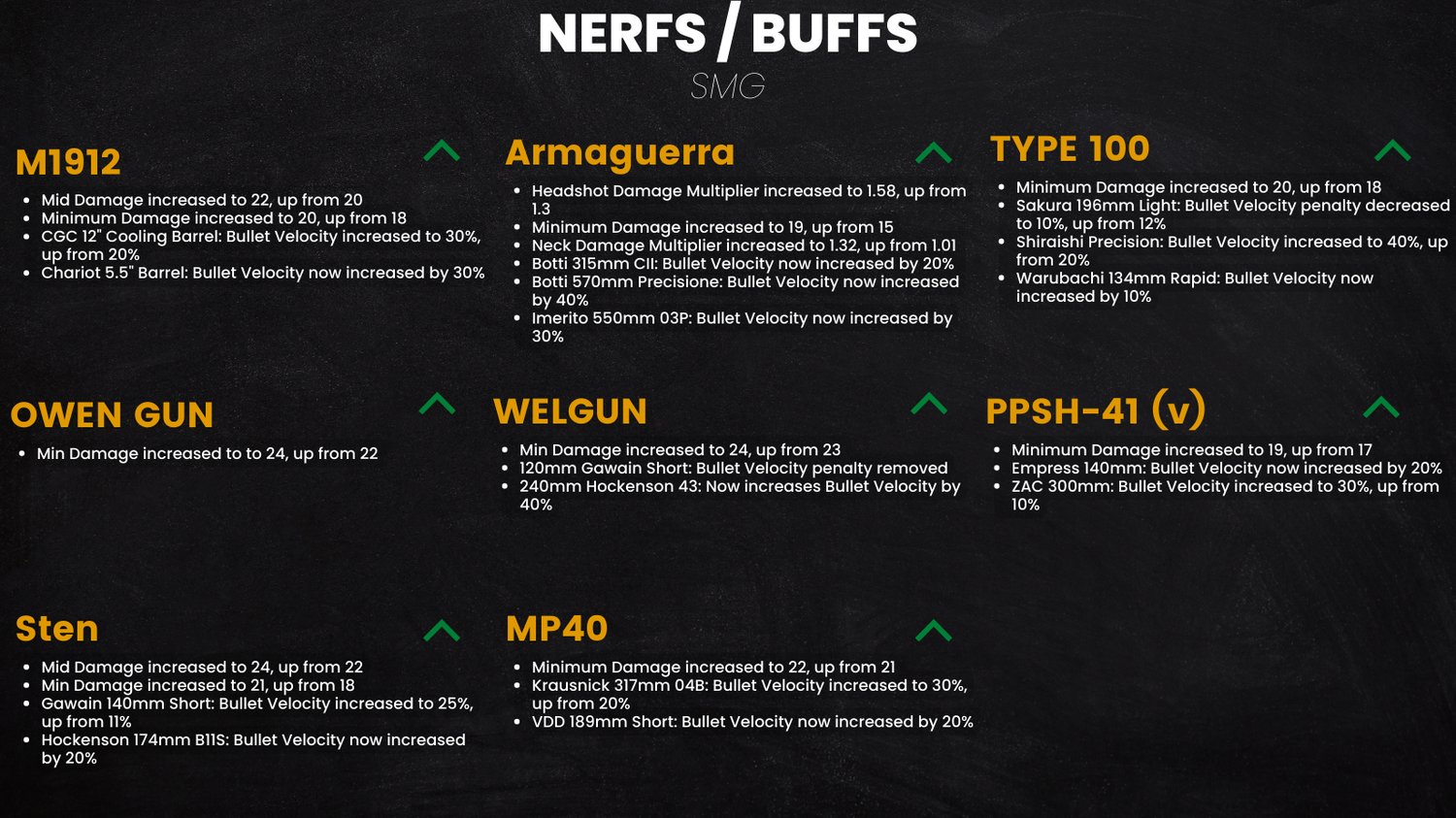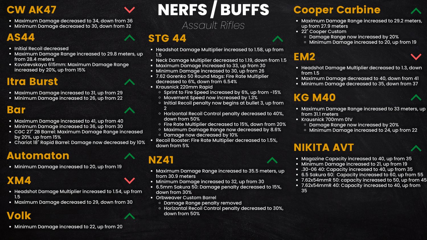 Az AR fegyverek esetében leginkább a minimum és maximum sebzésértékekhez nyúltak hozzá a fejlesztők, ám sok kiegészítő is javít majd a fegyverek kezelhetőségén. A legnagyobb buffot talán az STG 44 kapta, ahol a különféle testlövés szorzók is javultak, de a többiek sem panaszkodhatnak.