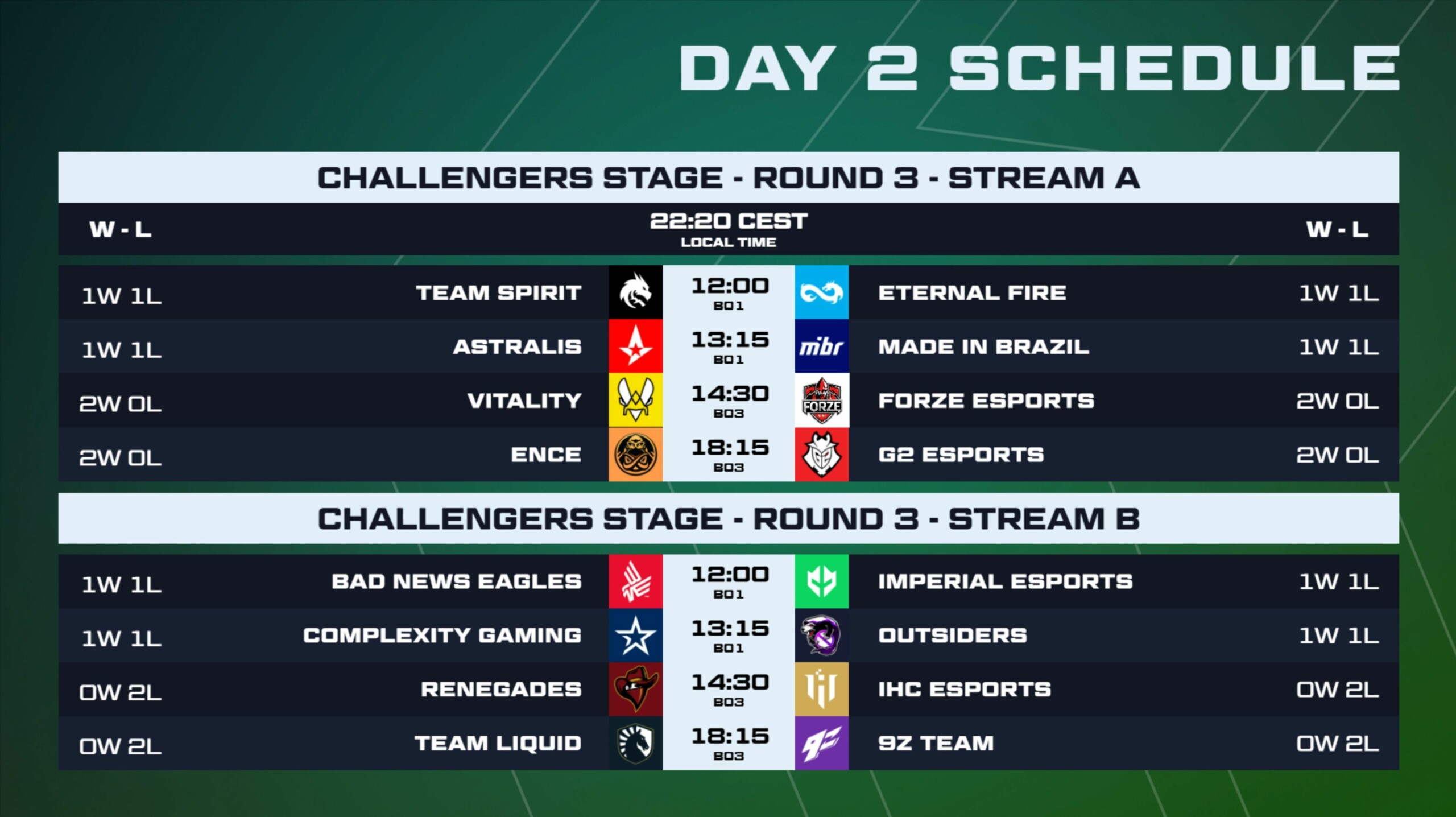 Ez a vesztesek összecsapása volt. Az EF, ha szorosan is, de kikapott a BNE-től, az ausztrálok pedig megpróbáltak derekasan helytállni a forZe ellen, de nem bírtak velük. A Renegades ezúttal Vertigót választotta, de a látottak alapján nem bizonyult jó döntésnek. A törökök nem ismertek kegyelmet. 13-2-es magabiztos első félideji győzelem után, a második félidőben sem lassítottak. 16-2-re megnyerték ezt a találkozót, így Ők 1-1-es állással ma ismát BO1-et játszanak, míg a Renegades 0-2-nél egy BO3-ban kell, hogy majd bizonyítson.