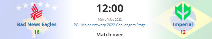 Hiába a nagyobb nevek a brazil csapatnál, mégis a koszovói alakulat volt a kiemelt csapat. Nagyon jól kezdte meg a találkozót a BNE Vertigón, amiből rigoN már a pisztolykörben kivette a részét 3 darab magabiztos USP-S fejessel. A megnyert pisztoly kör után sikerült még további 5 kört is bezsebelni a CT csapatnak, mielőtt az Imperial is feliratkozott volna az eredményjelzőre. Az első brazil győzelem után, megint rengeteget kellett várni, hogy legyen valami a terroroknál, így nem is meglepő a 13-2-es félidei győzelem a BNE részéről.