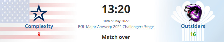 Hasonlóan érkeztek erre a mérkőzésre is a csapatok, mint az Astralis – MiBR találkozóra és itt is Overpass volt a választott pálya. Az első félidőben még volt adok-kapok a csapatok között, de a másodikban az Outsiders oktatta végig a Complexity-t ezzel, 1-2-vel a kiesés szélére küldték Őket. Ha ebből a meccsből, csak 1 klippre van időd, hogy visszanézd, akkor az ez legyen: