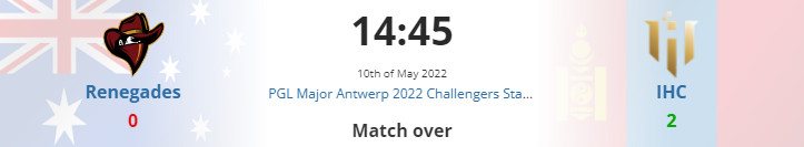 Az ázsiai RMR alkalmával már találkozott egymással ez a két csapat és akkor az IHC örülhetett, mivel 2-0-ra le tudták győzni az ausztrálokat. Ez most sem történt másképpen. A Renegades játéka arra volt elég, hogy szorosabb végeredmények szülessenek, de pályát így sem sikerült lopni az IHC-tól. Ezzel Ők lettek a Major első kiesői.