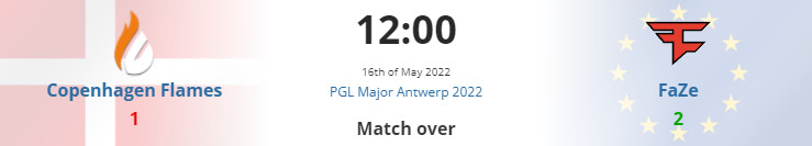A támadó oldalon kezdő FaZe nem sok kérdést hagyott a levegőben azzal kapcsolatban, hogy szerintük, ki az erősebb. Az első 14 körből, csupán 1 kör került a védekező dánokhoz. 13-2-es fordulás után a Flames még kapálózott, hogy ne legyen annyira csúnya a vége számukra, de a FaZe befejezte a meccset 16-6-ra.