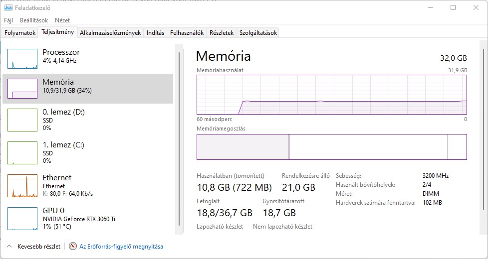 Több lehetőségünk is van az ellenőrzésre, szerencsére a Microsoft egy ideje a Feladatkezelőben is kiírja a RAM modulok órajelét, melyet bárki játszi könnyedséggel leolvashat. Ehhez meg kell nyitnunk a feladatkezelőt, majd a Teljesítmény fülön a memóriánkat kiválasztani. Az ablak jobb felében a „Sebesség:” szekciót kell keresnünk, mely választ is ad a fenti kérdésre.