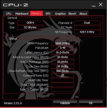 A Windows-ban kevésbé bízó felhasználók használhatják a CPU-Z programot is. Itt a Memory fülön a DRAM Frequency értéket kell keresnünk, melyet DDR esetében meg kell szoroznunk kettővel, hogy kijöjjön a valós sebesség. Jól látható, hogy itt is stimmel a matek, 3200 MHz-en mennek a modulok.