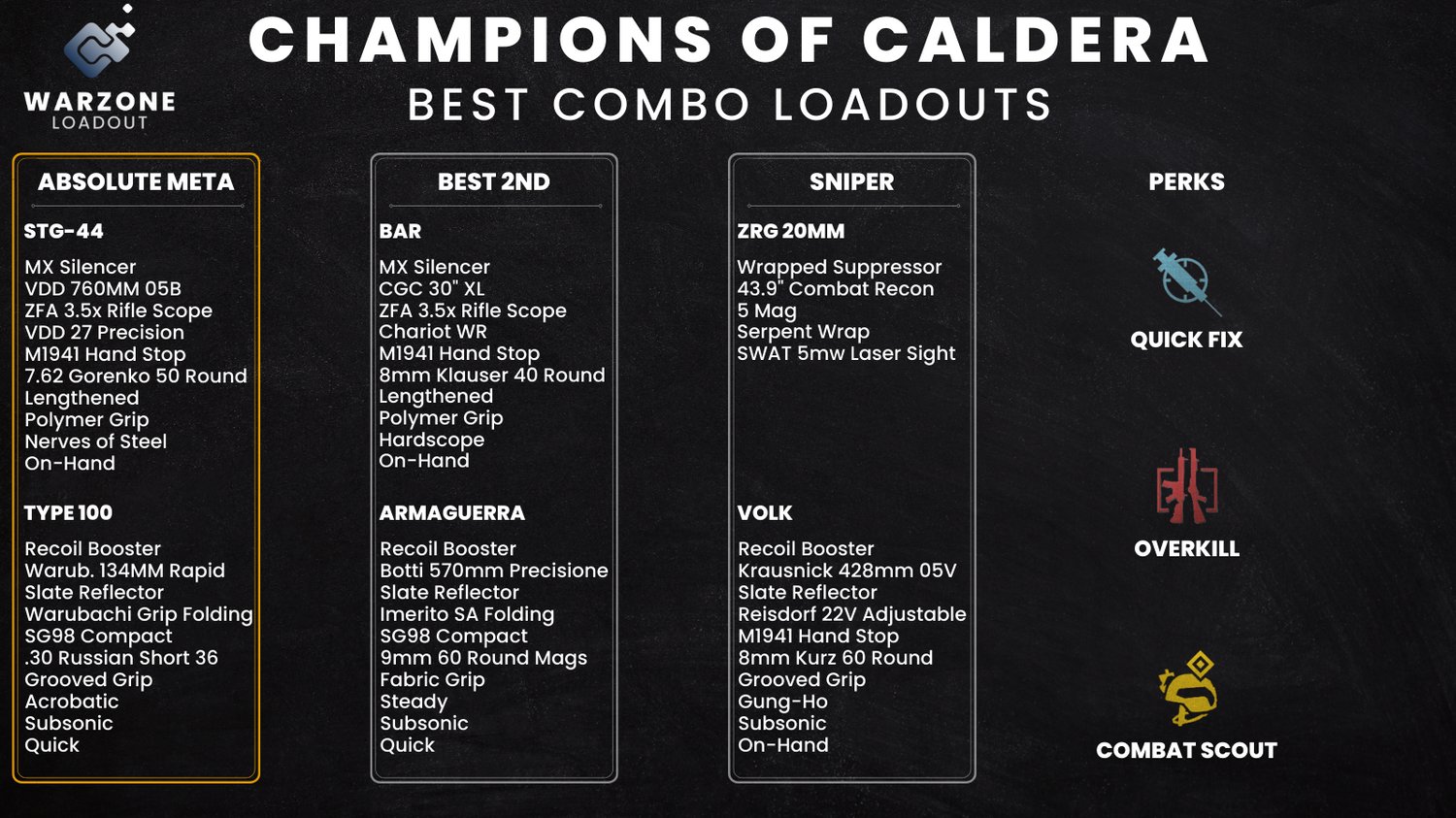 A Warzone statisztikák nagy ismerője, Warzone_Loadout jelentkezett egy közérthető, ám rettentően hasznos infografikával. Az Absolute Meta oszlopban a legütősebb kombinációt és az ajánlott attachmentek listáját találhatjuk. A másodikban egy hasonlóan jó alternatíva köszönt vissza ránk, míg a harmadikban egy olyan kombinációt láthatunk, melyeket a Sniper fegyverek kedvelőinek állított össze Warzone_Loadout. Az ajánlott perkek tekintetében a Quick Fix, Overkill és Combat Scout viheti a pálmát a Solo játékmódban.