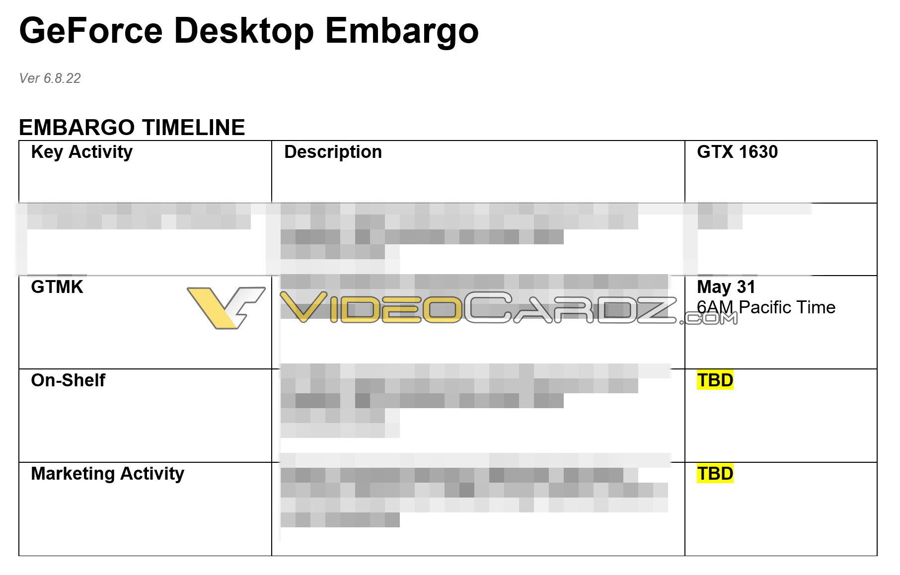 A legújabb, GTX 1630 Embargo dokumentumban az On-Shelf és Marketing mellett a korábbi június 15-ei dátum helyett egy „TBD” felirat szerepel, azaz maga a cég sem tudja még pontosan, hogy milyen dátumra időzítse át a startot és a reklámhadjáratot. Bejáratott chipről beszélhetünk, így ebben az esetben nem biztos, hogy technikai oka van a csúsztatásnak, ám az kétségtelen, hogy az utolsó pillanatokban adta ki erre a parancsot az óriáscég.