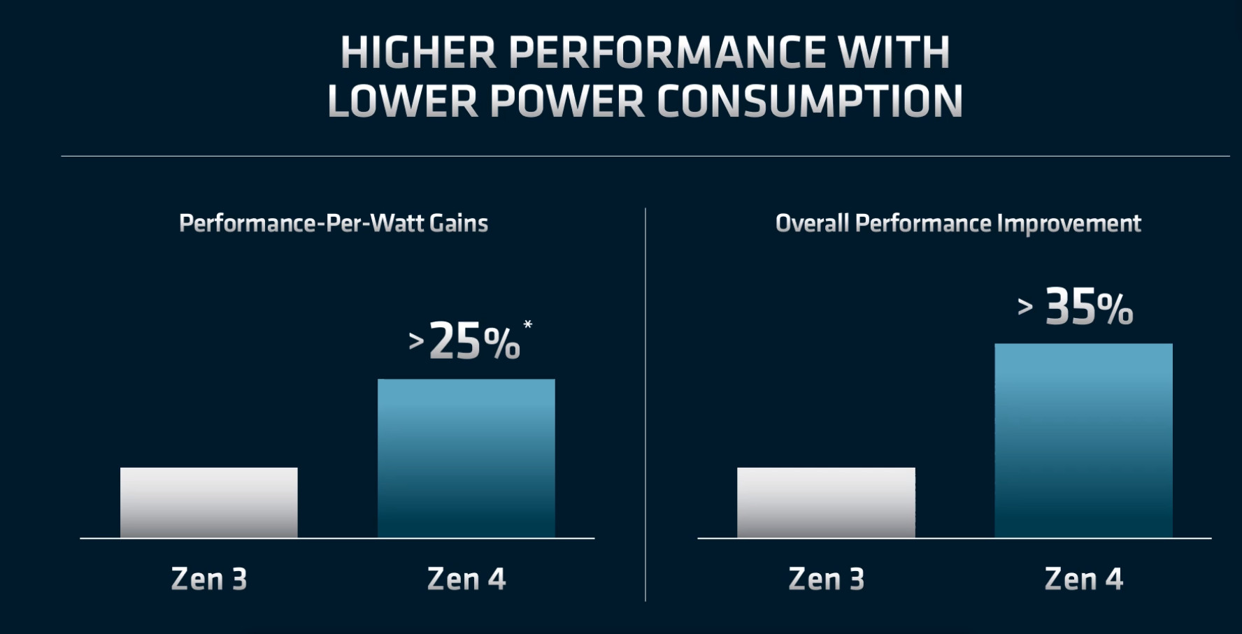 Az AMD a múlt hónapban megrendezett Computex kiállításon már bejelentette, hogy legalább 15%-os teljesítménynövekedést várnak egyszálas méréseknél. Elsőre nem győzött meg sokakat ez az érték, ám a fenti képen már láthatjuk, hogy ennél azért többre kell majd számítanunk. A következő generáció 25%-kal több teljesítményt ont ki magából wattonként, illetve összességében 35%-nál is nagyobb teljesítménynövekedésre kell kalkulálnunk.