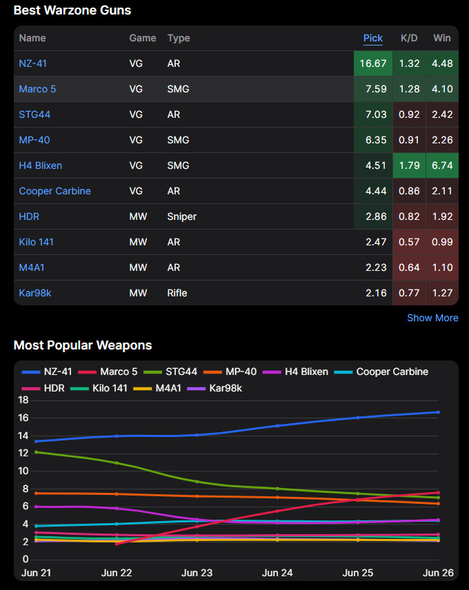 Április végén még a TOP 10-ben sem volt, ám a Season 3 frissítései megtették a hatásukat, ismét egy Vanguard AR csücsül a dobogó legfelső fokán. Olyannyira erős lett, hogy volt olyan időszak, amikor a második, harmadik és negyedik legnépszerűbb fegyver összesített Pick aránya volt hasonlítható csak az STG-44 népszerűségéhez. Egészen a Season 4-es frissítés érkezéséig nem volt ellenfele, ám az egykori királyt immáron „csak” a harmadik helyen találjuk meg.