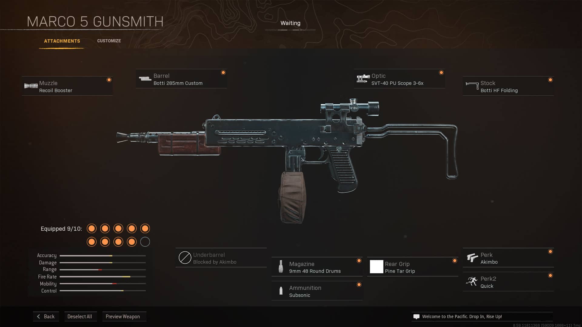 Ennek a Marco 5 loadoutnak az a lényege, hogy közelről minél jobban ledaráljuk a játékosokat, tehát a tüzelési sebesség javítására összpontosít. A Recoil Booster és a Botti VL javítják a tűzgyorsaságot, csökkentve némileg a TTK-t. A Botti HF Folding Stock és a Pine Tar Grip viszont növeli a hip-fire pontosságot. Természetesen kell az Akimbo perk, de mivel így nem lehet ADS-t használni, jól jön a 1229/Slate 3.25x Custom optika, ami szintén növeli a pontosságot.