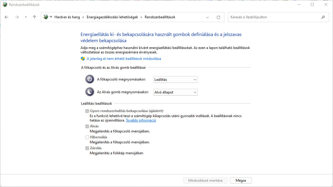 A másik, sokaknál működő módszer a Gyors rendszerindítás/Fast Boot kikapcsolása volt. Kikapcsolásával minimálisan megnőhet a Boot ideje, ám modern SSD-knél így sem kell sokat szenvednünk. Az alábbi útvonalon érhetjük el a fenti menüt: „Vezérlőpult\Hardver és hang\Energiagazdálkodási lehetőségek\Rendszerbeállítások”. Itt a jelenleg el nem érhető beállításokra kell kattintanunk, majd ki kell vennünk a pipát a Gyors rendszerindítás elől.