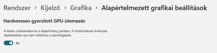 Windows 10-ben és 11-ben is megtalálható a HAGS, mely a Hardveresen gyorsított GPU-ütemezést rövidítése. Windows 10-ben alapértelmezetten kikapcsolt állapotban találhatjuk meg, Windows 11 esetében azonban gyárilag bekapcsolták nekünk a Microsoft mérnökei. Több felhasználó is pozitív eredményeket tapasztalt a kikapcsolása után. A „Rendszer / Kijelző / Grafika / Alapértelmezett grafikai beállítások” szekcióban kapcsolhatjuk ki a HAGS-t.