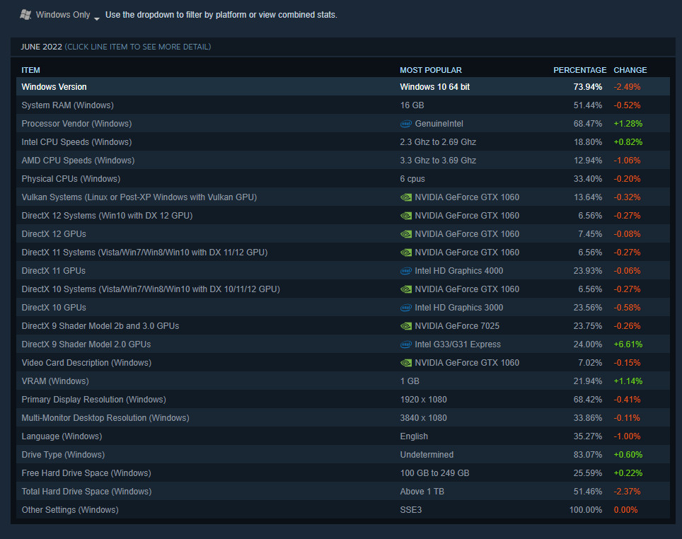 Manapság, amikor a videókártya-piac kezd kicsit helyreállni, sokszor előkerül az a kérdés, hogy mit értünk az “átlagos” gaming PC kifejezés alatt. Ezt meglehetősen nehéz lenne megválaszolni, hiszen egy többmilliós gép tulajdonosa teljesen mást értene ezalatt, mint az, aki 2010 óta ugyanazt a PC-t használja. Ilyenkor érdemes valamilyen statisztikához nyúlni, talán a legjobb választás a szinte minden gépen ott figyelő Steam lehet.