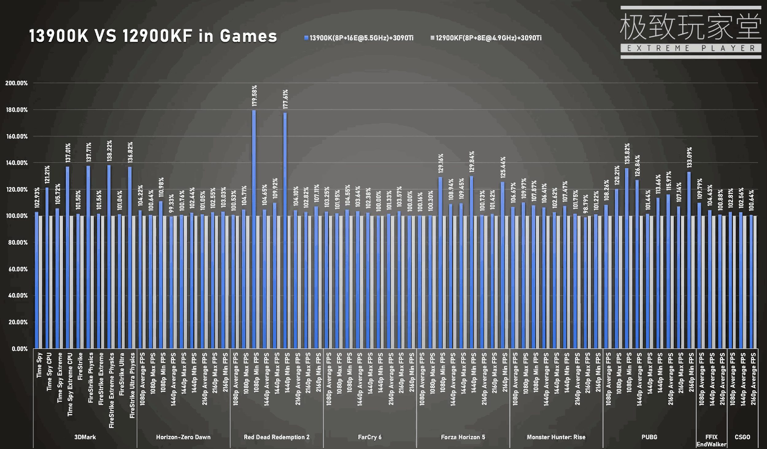 A fenti diagramon az i9-13900K-t és az i9-12900KF-et hasonlíthatjuk össze Horizon Zero Dawn, Red Dead Redemption 2, FarCry 6, Forza Horizon 5, Monster Hunter: Rise, PUBG, Final Fantasy Endwalker, CSGO és 3DMark tesztek alatt. Jól látható, hogy az alap FPS szám nem minden esetben nőtt, ám a minimum framerate 11% és 28%-kal jobb volt az új processzor alatt. Így simább, tisztább játékmenetet kaphatunk, jóval kevesebb mikroakadással.