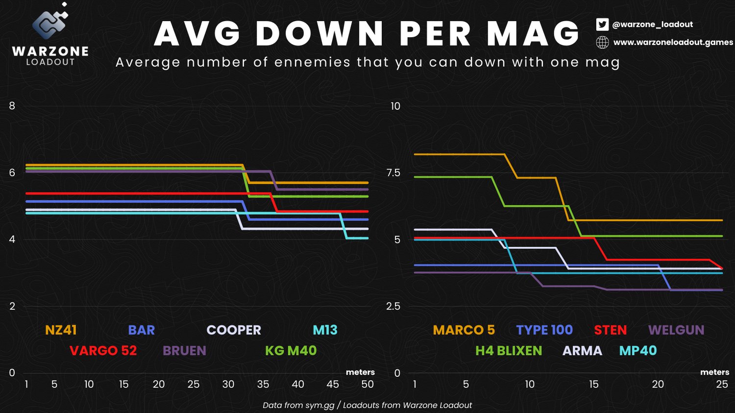 A bal oldali szekcióban az AR fegyvereket, míg jobb oldalon az SMG-ket tekinthetjük meg. A függőleges tengelyen az egy tárból megölhető ellenfelek átlagos számát, míg a vízszintes tengelyen a távolságot olvashatjuk le. Jól látható, hogy az SMG fegyverek 25 méteren háromszor is „gyengülnek”, míg AR fegyverek esetében 30 méterig nem változik egyik érték sem. Ezúttal sem lepődünk meg, hogy a Marco 5 és az NZ-41 nyeri ezt a csatát is, nem véletlenül állnak a WZRanked lista élén manapság.