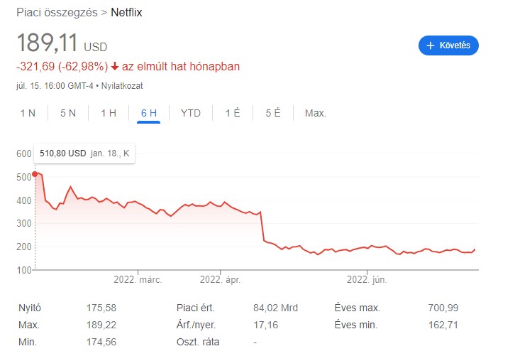 Sajnos az év első felében rengeteg szomorú hír érkezett a Netflix háza tájáról. Áprilisban bejelentették, hogy előfizetőket veszítettek el 2022 első negyedévében, mely az elmúlt évtizedben példátlan volt, soha nem fordult elő. Természetesen a tőzsde brutálisan reagált erre a hírre, jelentős csökkenésnek indultak el a Netflix részvények árai, jelenleg is ~62%-os csökkenést olvashatunk le a féléves grafikont böngészve.