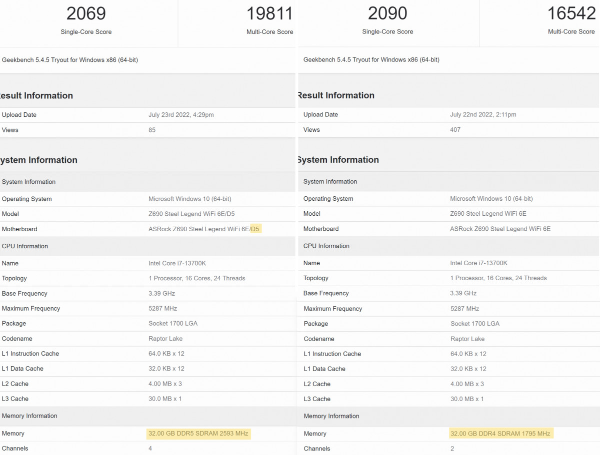 Az elmúlt napokban több, 13. generációs processzor benchmark is felkerült a Geekbench oldalára. Külön érdekesség, hogy az i7-13700K-ból kettő is, egy DDR4 és egy DDR5 memóriával megtámogatott mérést is megtalálhatunk az oldal keresőjében. A fenti pontszámok alapján úgy tűnhet, hogy a régi RAM-ot támogató felállás jelentősen gyengébb lehet a másikhoz képest, hiszen több ezer ponttal kevesebbet kapott a többszálas teljesítményére. A jelenlegi, 12. generációs tulajdonosok egy része el is kezdett pánikolni az eddig nem tapasztalható eltéréseket látva. Tényleg ekkora lenne a különbség?