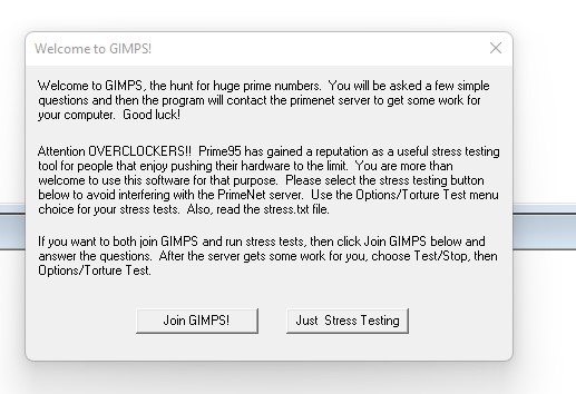 Igazi veterán programnak számít ebben a kategóriában. Néha azonban irreális teljesítményt kívánhat meg a processzortól, így kicsit érdemes lehet finomhangolni futtatás előtt. A program az indításnál megkérdezi, hogy szeretnénk-e csatlakozni a GIMPS programhoz, ám nekünk a Just Stress Testing opció kell csak.