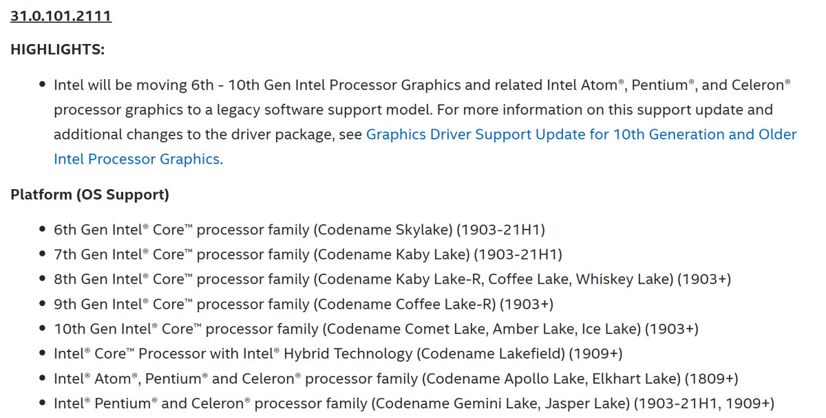 A frissen megérkezett, 31.0.101.3222 verziószámot viselő Intel IGP illesztőprogram leírásában olvashattuk hivatalosan is az Intel terveit. A 6. és 10. generációs Core (Comet Lake, Kaby Lake, Skylake etc.), illetve Atom, Pentium modellek bizony Legacy ágra kerülnek. Ez azt jelenti, hogy újabb funkciókkal már nem igazán gazdagodnak a jövőben, illetve sokkal kevesebb frissítés érkezik hozzájuk. A kritikus, gépünk biztonságát is befolyásoló hibákat papíron az Intel javítja majd, így azoktól nem kell tartanunk a fenti modellek esetében sem.