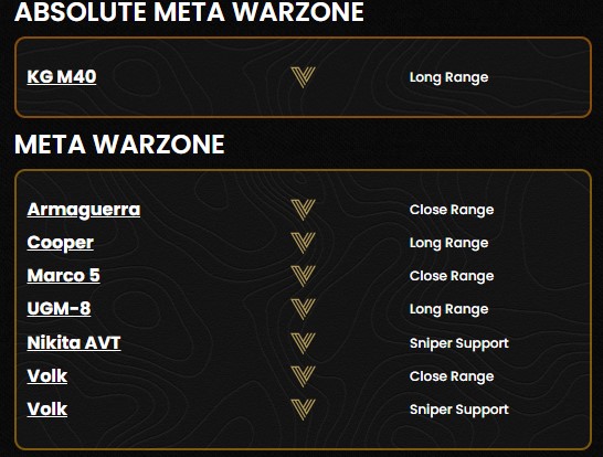 A fenti opciók mellé az Armaguerra, Nikita AVT, UGM-8 fegyvereket lehetne még sorolni az első augusztusi frissítés után. Az update legnagyobb vesztese a H4 Blixen és az NZ-41 lehet, ezek az Absolute Meta és Meta kategóriából is kiestek, a korábban emlegetett Type 100, Kilo 141 és M13 fegyverekkel egyetemben. A pénteki lista jelenleg a következő a Warzone Loadout statisztikák alapján: