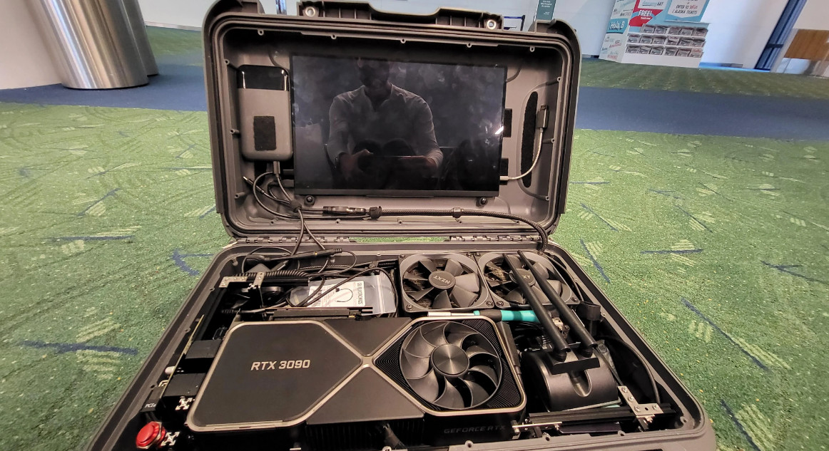 A kézipoggyász méretű gaming PC-ben RTX 3090, 16 magos Ryzen 9 5950X, 128 GB DDR4-3200 RAM, 2 TB-os NVMe SSD és 4 TB-os 2,5 hüvelykes SSD kapott helyet.