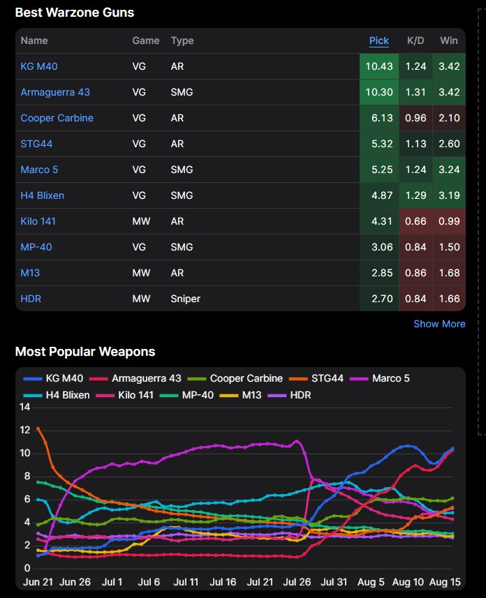 Ismét eltelt két hét, mióta utoljára fellapoztuk a WZRanked népszerűségi listáját, ezúttal azért tesszük ezt, hogy megnézhessük, mely fegyverek lettek a legjobbak a napokon belül végéhez érő Season 4 utolsó napjaira. Ha a legjobb 10 fegyvert nézzük, akkor gyakorlatilag hetente egy új listát készíthetünk az éppen aktuális meta fegyverekről, ám a múltban TOP 5-ön belül is szépen cserélődtek a különböző AR-ek és SMG-k, volt ami teljesen eltűnt a süllyesztőbe, míg más a 20. helyről meg sem állt a dobogóig. Most, hogy már eltelt bő egy hét a legutóbbi frissítés óta, reális képet kaphatunk, hogy mennyire nyúltak bele a fejlesztők az erőviszonyokba.
