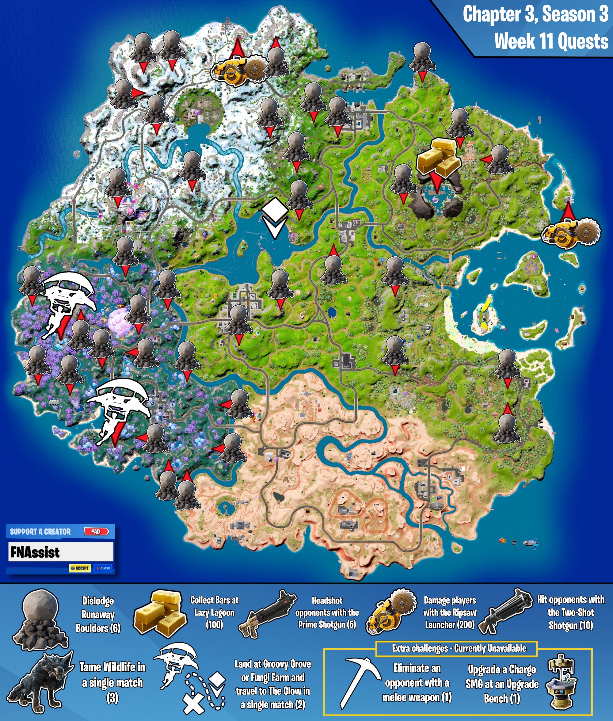 Ahogy arra számítani lehetett, a hét második felében megérkezett a Fortnite Season 3 küldetéseinek tizenegyedik adagja, mellyel ismét léphetünk pár szintet a Battle Pass belépőben. Nagy meglepetésekre ezúttal sem kell számítani, a rutinos játékosok hamar letudhatják a feladatokat. Ismét hét kihívás várja a felhasználókat, melyeket tetszőleges sorrendben teljesíthetnek.