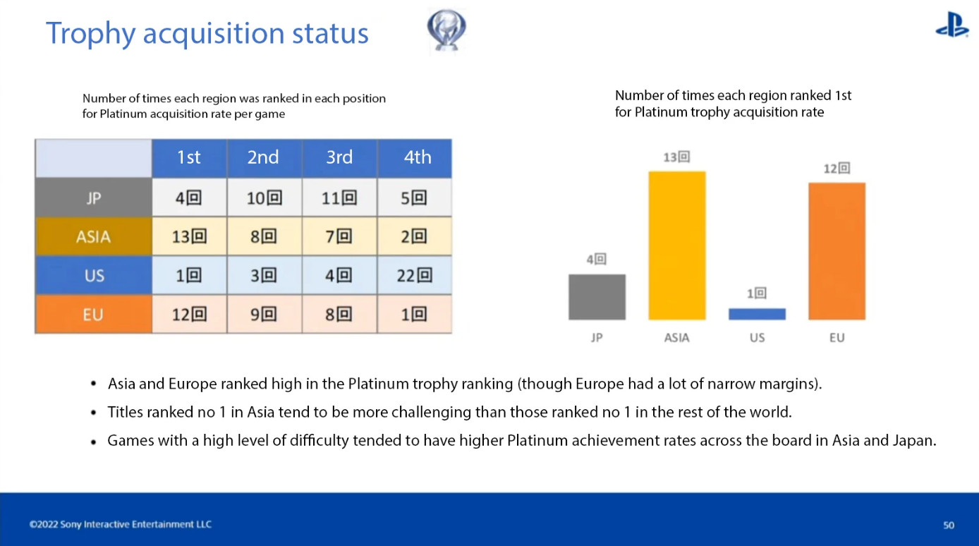 Akiyama ugyanakkor arra is felhívta a figyelmet, hogy míg a japán játékosok majdnem olyan alacsonyan szinteket szereznek meg, mint az USA játékosai, a legnehezebb játékokban viszont Japán és Ázsia sokkal gyakrabban kap Platinum trófeát.