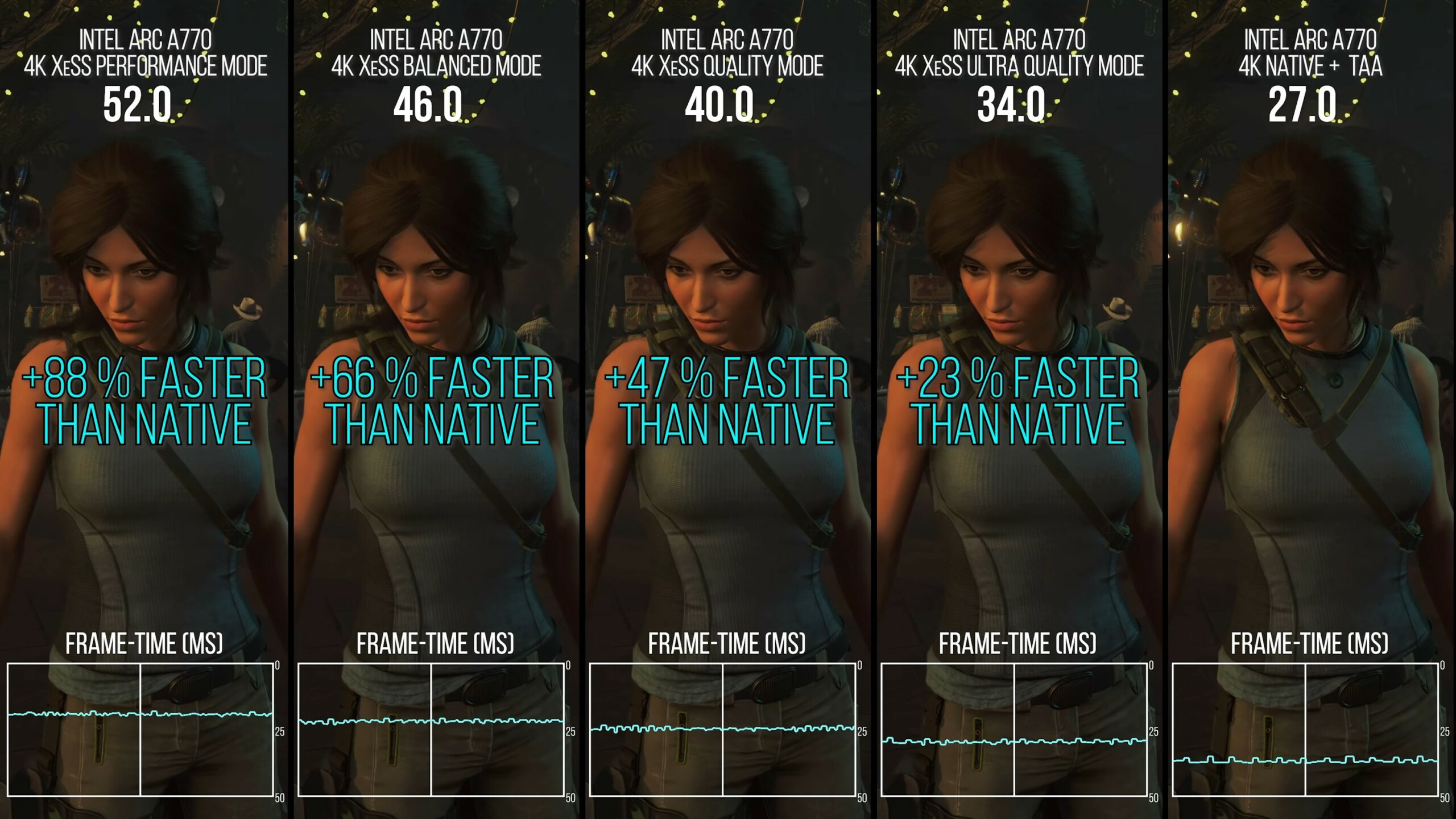 A Digital Foundry munkatársai A770 és RTX 3070 kártyákon tesztelték az újdonságot. A fenti összehasonlító képen jól látható, hogy 4K felbontásban majdnem duplázni is sikerült a Performance presettel, de a Balanced is kellemes, 66%-os FPS növekedést prezentált. Fontos kiemelni, hogy az Intel XeSS rendelkezik egy Ultra Quality móddal is, mely azoknak jöhet majd jól, akik éppen a határon (60, 75, 144 FPS/Hz) ugrálnak, ám továbbra is a legszebb képet szeretnék kapni. A 23%-os növekedés átlendítheti őket a kritikus számokon, miközben a kép minőségén gyakorlatilag nem esik csorba. A XeSS hivatalosan még egyetlen egy játékban sem található meg, ám remélhetőleg a globális start jelentősen lendít ezen az elkövetkezendő hónapokban.