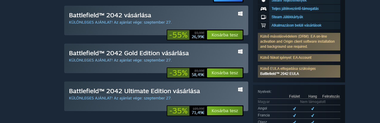 A Steamen most 7 Battlefield játék akciós, némelyik 80 százalékos kedvezménnyel.