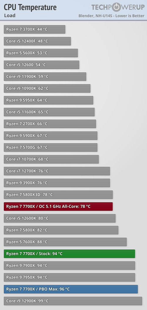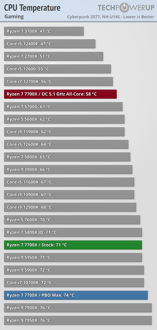 Az új Ryzenek teljesítményére tehát nem lehet panasz, ám a legtöbb tesztben negatív színben tüntették fel a processzorok hőmérsékletét. A TechPowerUP szakemberei egy Noctua NH-U14S léghűtést használtak, ám 100%-os használat mellett az i7-12900K tartományait karcolgatták az AMD újdonságai, miközben az i7-12700K 20 fokkal hűvösebbnek bizonyult. Úgy tűnik, hogy jogos volt a kritika, bár játékok alatt azért nem kell ilyen szintű melegedéstől tartania senkinek.