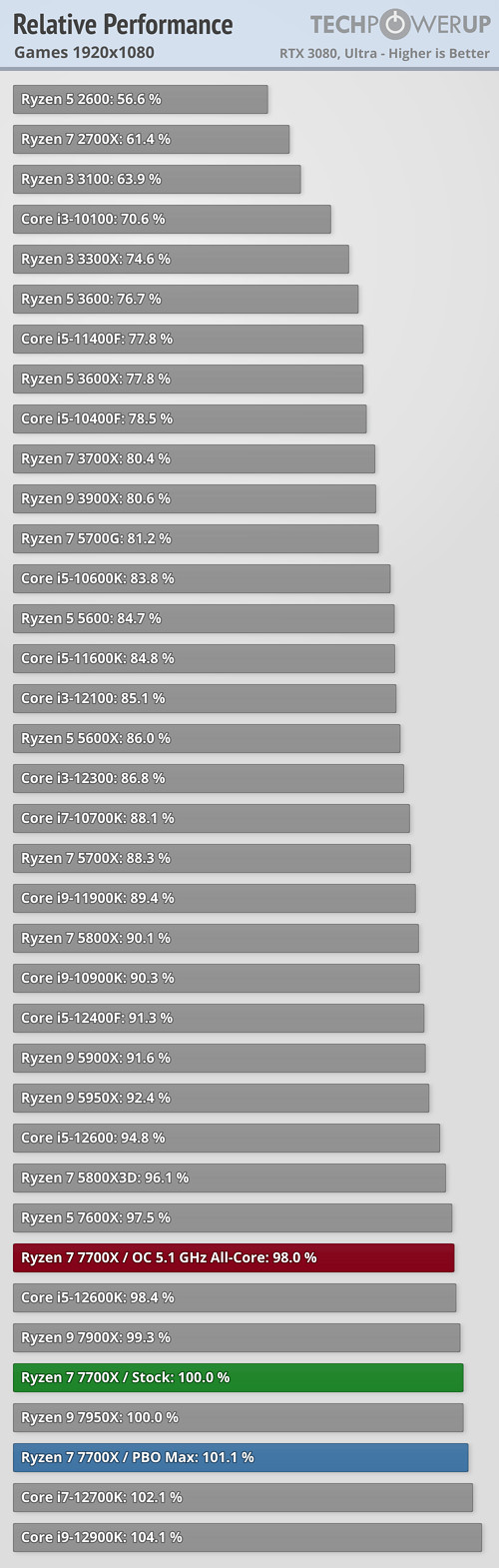 A fenti képen mind a négy AMD újoncot megtalálhatjuk. Több dolgot is megfigyelhetünk a százalékokat böngészve. Egyrészt jól látható, hogy a legjobbak között van szinte az összes Ryzen 7000-es processzor, ám az Intel 12. generáció i7 és i9 modellje pár százalékkal jobbnak bizonyult a több játékot felvonultató tesztek során. Másrészt érdemes kiemelnünk a korábbi generáció 5800X3D modelljét, mely az AM4 alaplapok tulajdonosai számára kiváló alternatíva lehet a teljes váltás helyett.