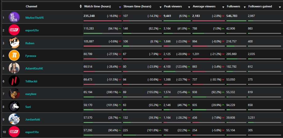 A legnézettebb tartalomgyártó, a trónját az óriási balhéba keveredő NerdHub Vendeltől visszafoglaló TheVR összesített nézettségben ugyan toronymagasan veri az egész mezőnyt (még a másodikat is duplán előzi), a SullyGnome statisztikai oldal mérései alapján azonban a debreceni csapatot 16%-kal nézték kevesebbet szeptemberben. Ennek oka lehet, hogy kevesebb élő is indult a Twitchen, a mérések szerint ugyanis közel azonos mértékű a csökkenés. A legtöbb egyidejű nézőszámban viszont sokkal jobban teljesítettek, amikor szeptember 10-én több mint 9400-an gyűltek össze az adásuk alatt – ami 6,5%-kal volt magasabb, mint az augusztusi rekord.